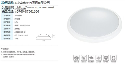 消防应急挂壁式吸顶灯该产品严格按照GB17945—2010标准设计制造,用于安装在公众场所中,以应付火灾、地震及各种突发事故性而引起停电时,为人员疏散及各种安全作业起指示作用的灯具。此灯具工作时无对周边环境已及能源产生影响。